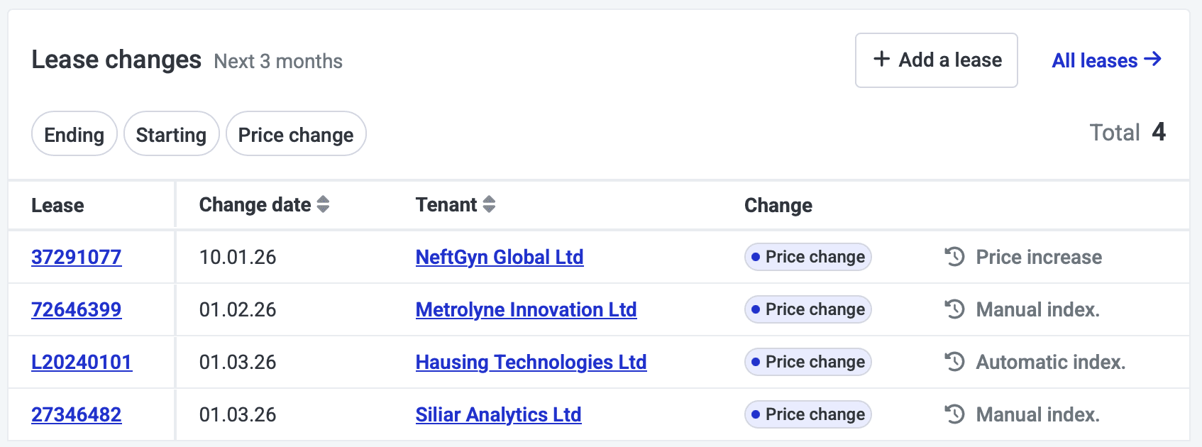 Dashboard – we added lease changes section, where you can quickly see what changes (lease endings, beginnings, indexations) are coming in the next three months.