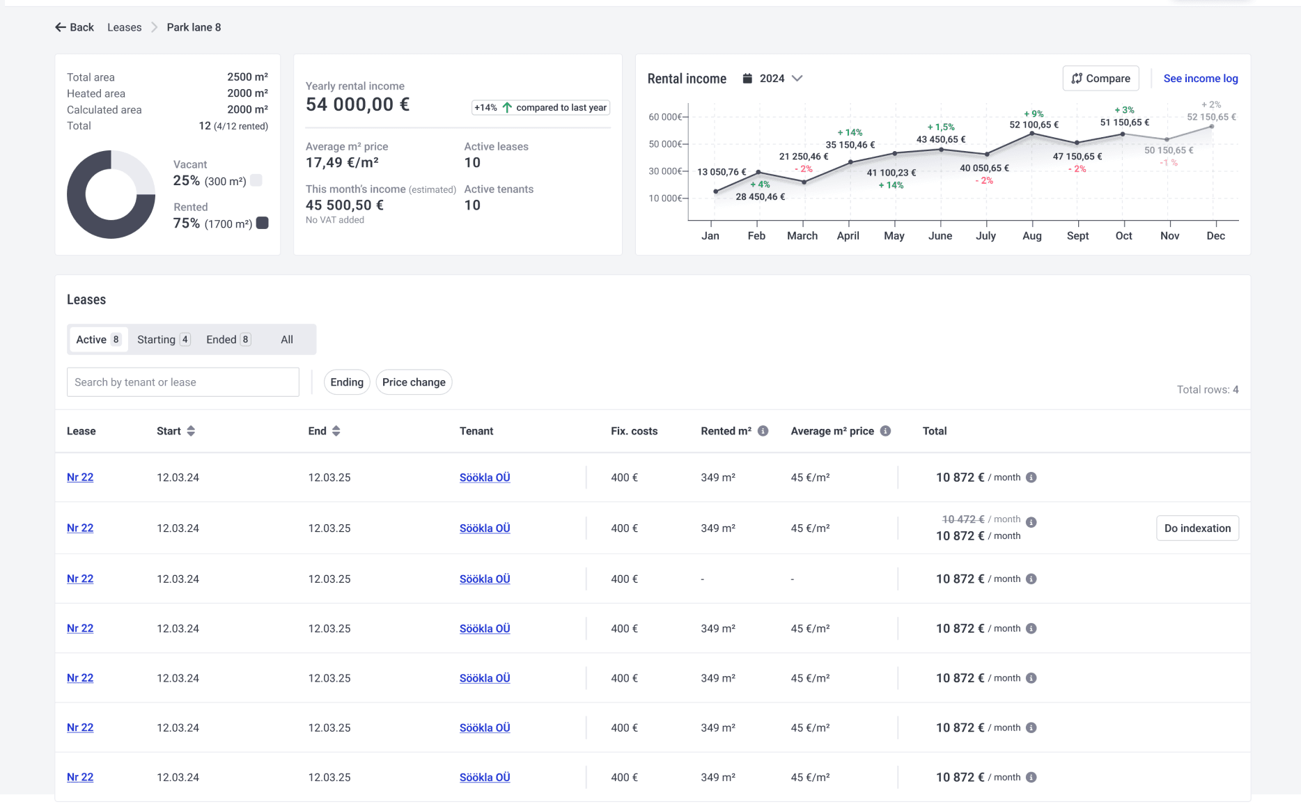 “We have 100+ tenants and eventually it got too confusing to manage it all in Excel. Each month we had to keep an eye that all the formulas were correct, the arrival and departure dates were included correctly in cost sharing etc. Also there were no reminders of the contract deadlines or rental price changes, so a lot of manual work had to be done.”
