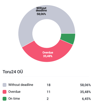In the work orders menu, the analytics show statistics on external partners’ task deadlines. That means small graphs appear in the system where you can quickly see whether the responsible person, internal executor or external executor have completed tasks on time or not.