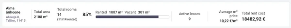 The lease agreement menu has a new look, where you can quickly see how much of the building is leased out, how many active agreements the building has, the average price per m², and the total rental amount.