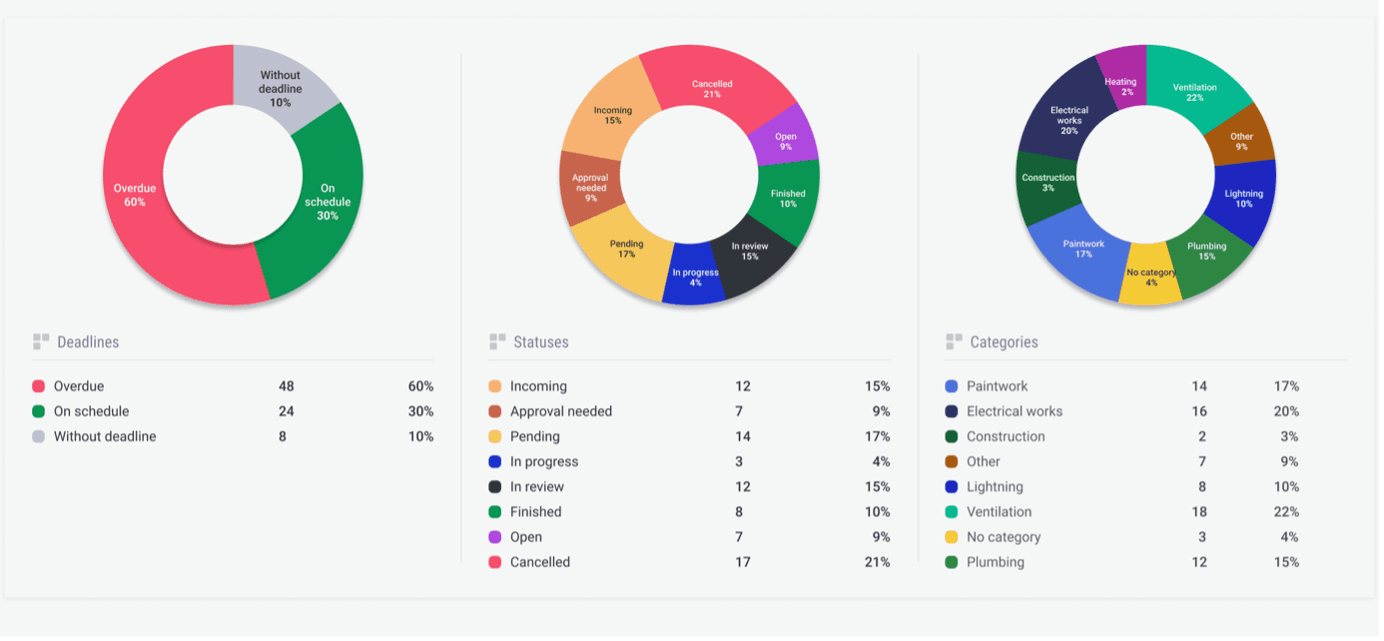 In Hausing, you can quickly see statistics about deadlines, statuses and work order categories.