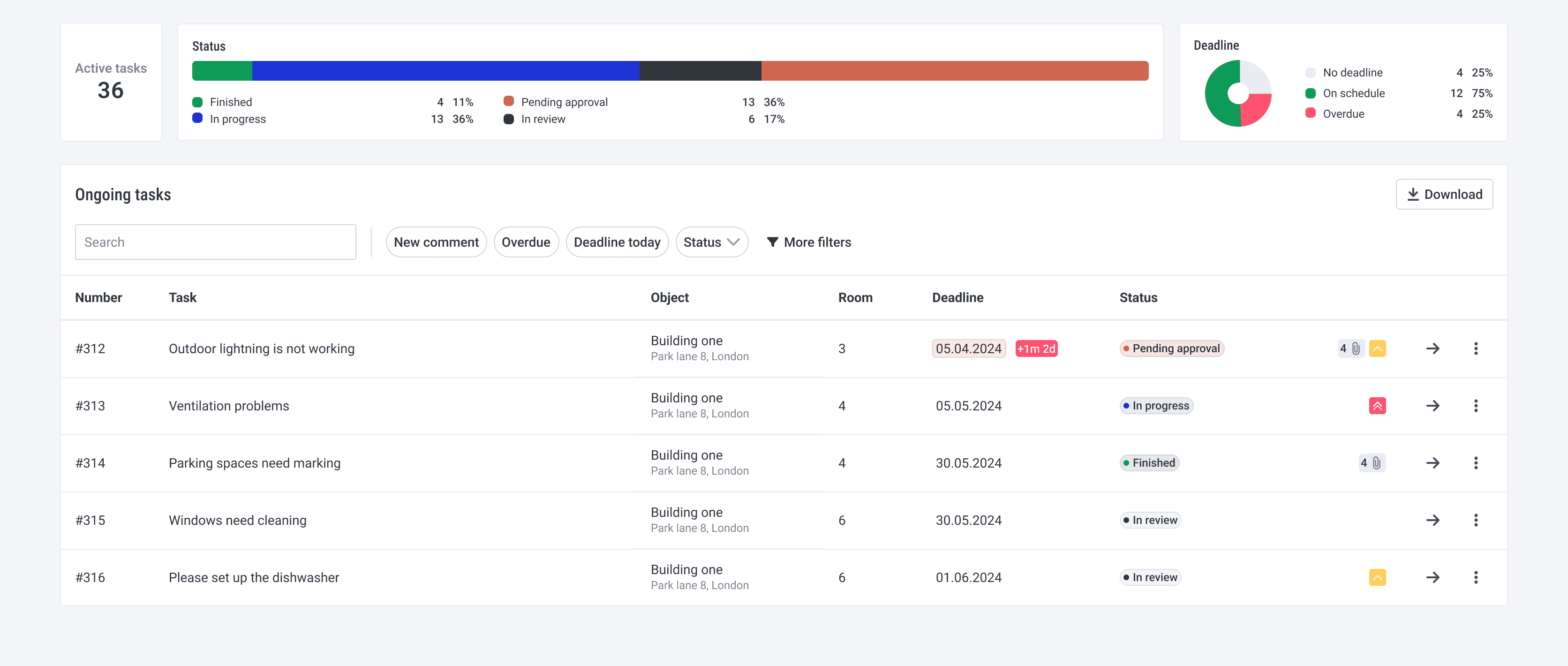 Tracking progress – team members can update tasks progress. This way everyone can stay in the loop and there is no need to ask about updates yourself. Moreover, with data analysis property managers can quickly identify any bottlenecks or delays in the workflow.